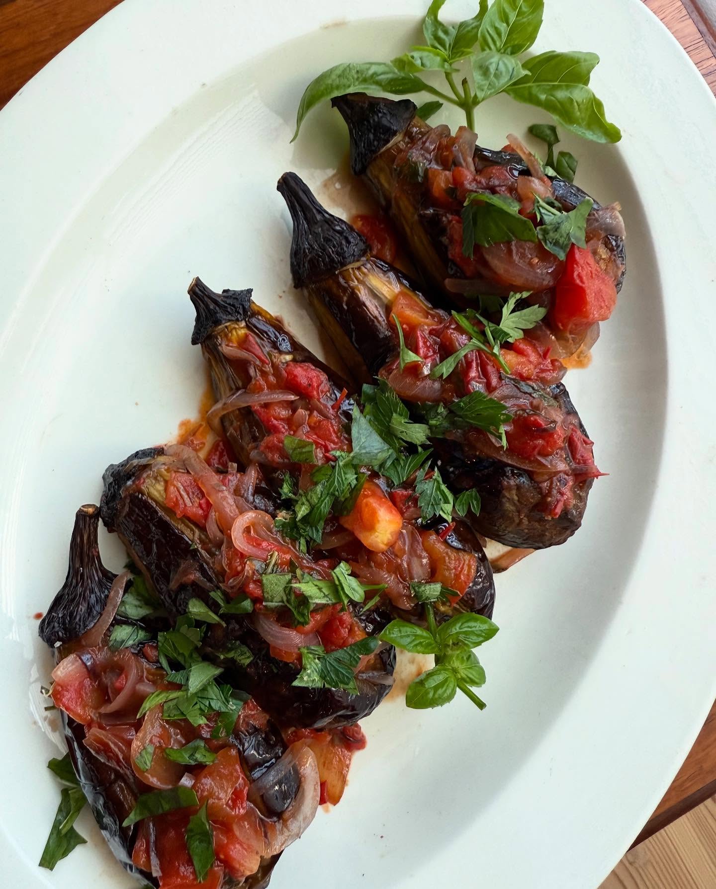 フレッシュ感を残したトマトソースを揚げ焼き茄子に詰めたシンプルな料理。だけど確かに、禁欲とは真逆にいるわたしでも、軽くクラっとします。